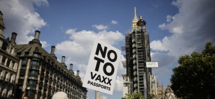 영국 런던 의회 광장에서 열린 백신 반대 시위에 참석한 한 남성이 코로나19 백신 여권 반대 플래카드를 들고 있다.