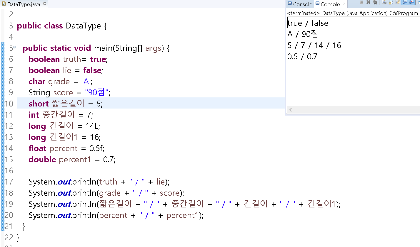 - 자바의 예약어(boolean, class, public...)는 변수명(식별자)으로 사용할 수 없다.