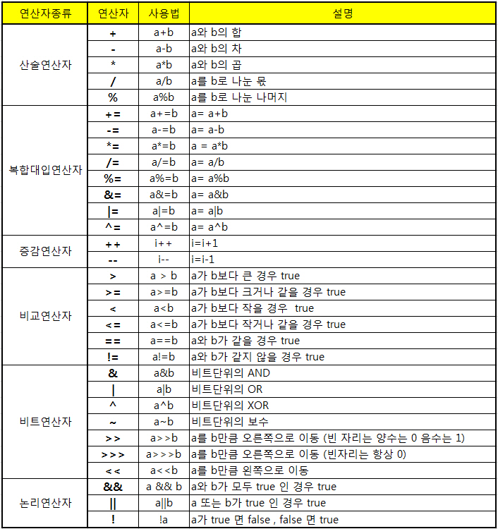 1. 산술(수치) 연산자 : +, -, *(×: 곱하기), /(÷: 나누기), %(나머지, 모듈러스 연산자)